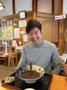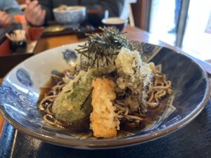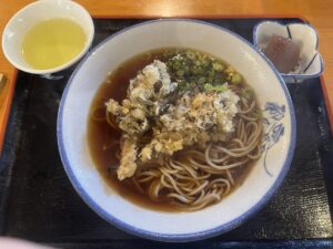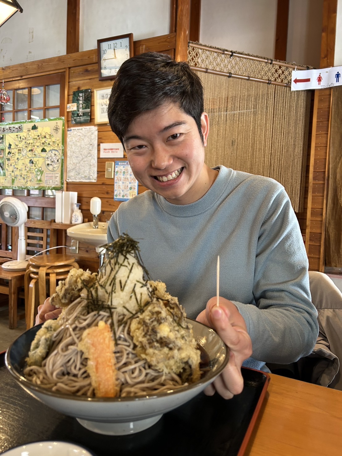 2026.01.13 くんま水車の里でランチ 道の駅・くんま水車の里のお食事処でおそばをいただきました!私が食べたのは温かい舞茸天ぷらそばです!舞茸の天ぷらめっちゃおいしい! 向かいでは、熊二郎が……大きすぎる…… 三人前の麺と天ぷらが文字通り山のように盛られています! 見事完食されていました!すごい お土産コーナーではみかんを買いました。一個一個が大きくて、果汁たっぷりで甘いです! Vn 豆太郎