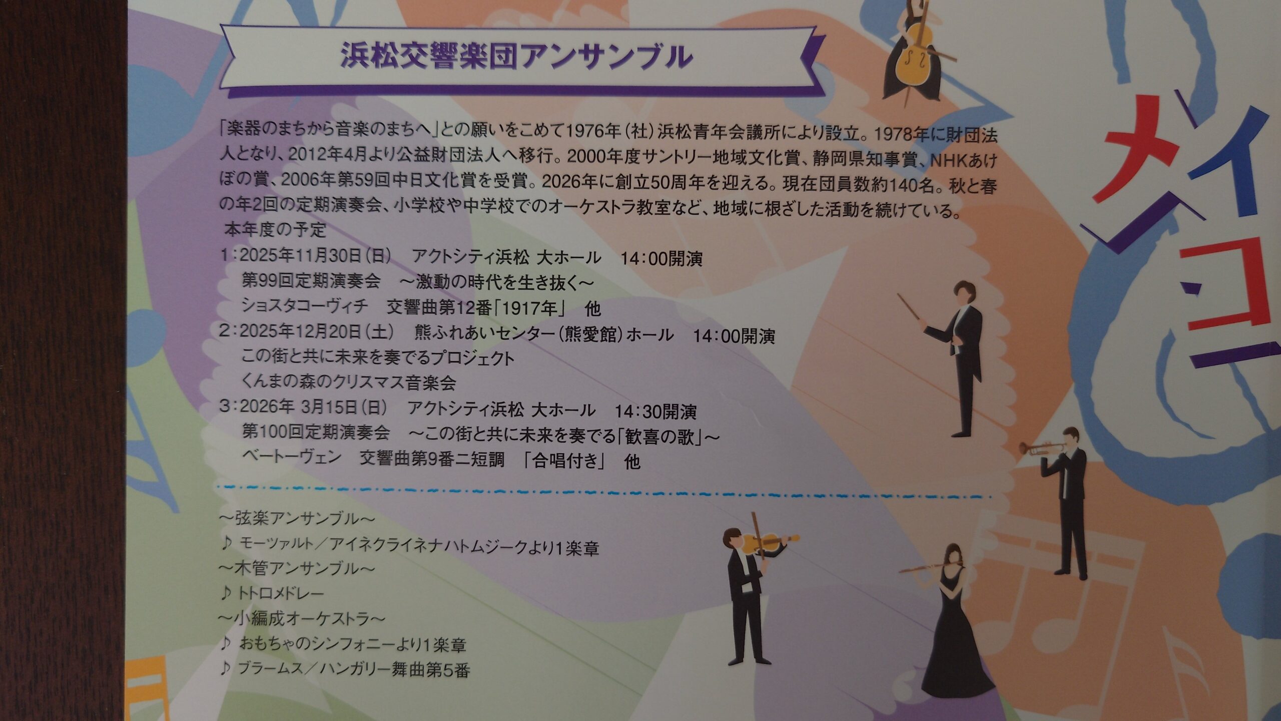 ホールでの私たち浜響の演奏は1番目。幕が開くと同時に弦楽アンサンブル。次に木管五重奏。そして小編成オーケストラの演奏。おもちゃのシンフォニーでは管楽器が「おもちゃ」を担当。私は水笛でした。息を長ーくコップの水を竹笛でピロピロピロ〜と、楽しかったです。アンコールのラデッキー行進曲では、会場のお客さまの楽器(手)をおかりしてテンポよく手拍子をしてくださり、演奏が盛り上がりました。